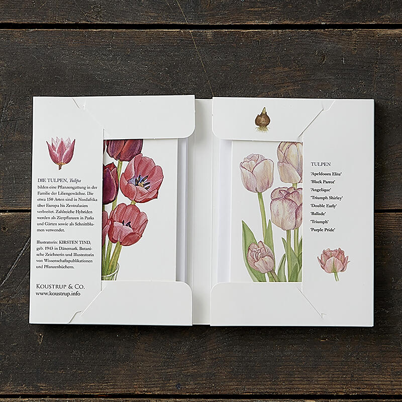 El estuche de tarjetas contiene 8 sobres y 8 tarjetas dobles diferentes con motivos de tulipanes.