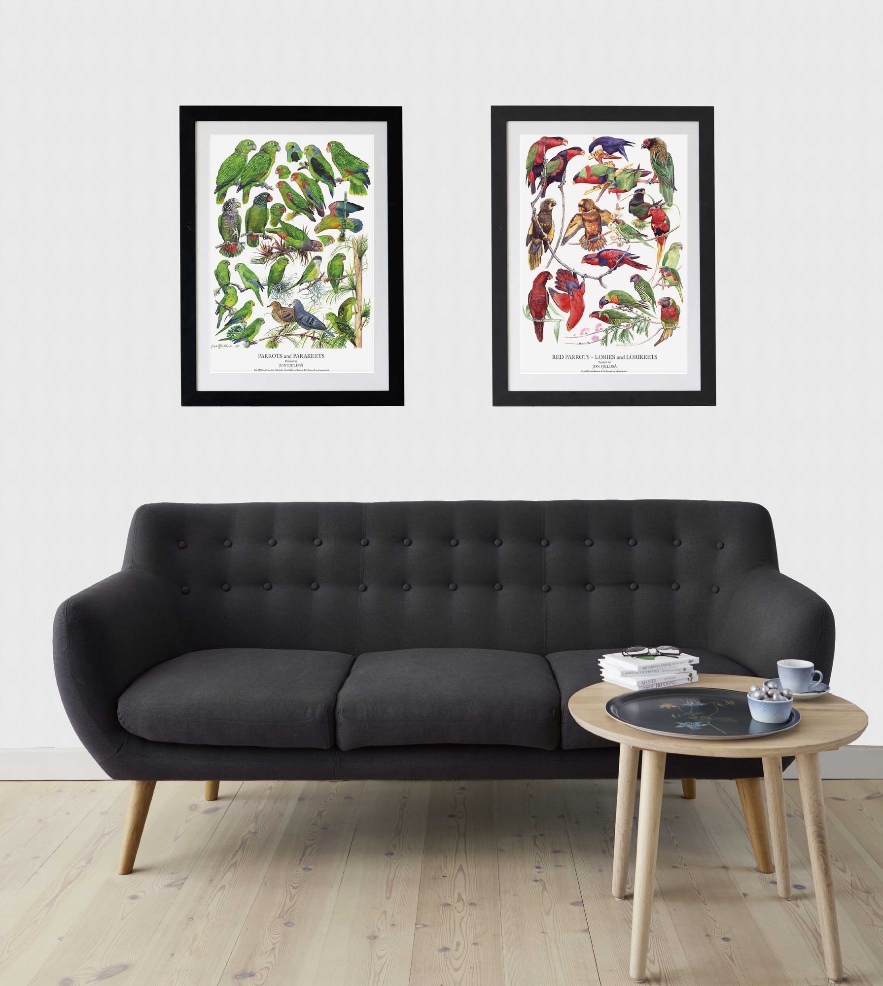 Juliste A2-koossa, jossa on koristeellisia ja näyttäviä punaisia papukaijoja. Kuvittaja: Jon Fjeldså.