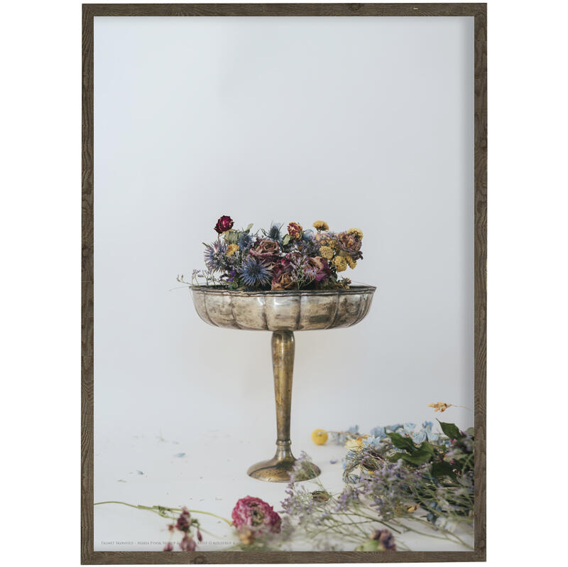 Matala ja tiheä kukkakoriste sijoitettuna kullattuun jalustaan.