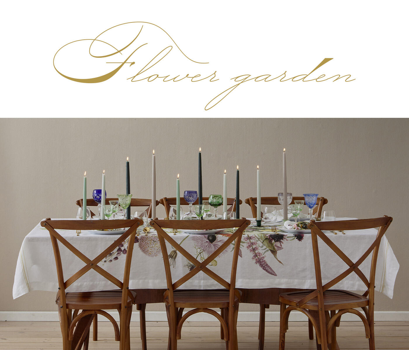 Forestil dig en smuk blomstereng med skønne dufte af pæoner, snerler og scabiosa. Flower Garden er en kollektion med et fantastisk blomstermotiv i skønne farver. Kollektionen indeholder bakker, sengetøj, servietter, duge, glasbrikker og mange andre lækre produkter, og den er skabt i samarbejde med Jim Lyngvild.