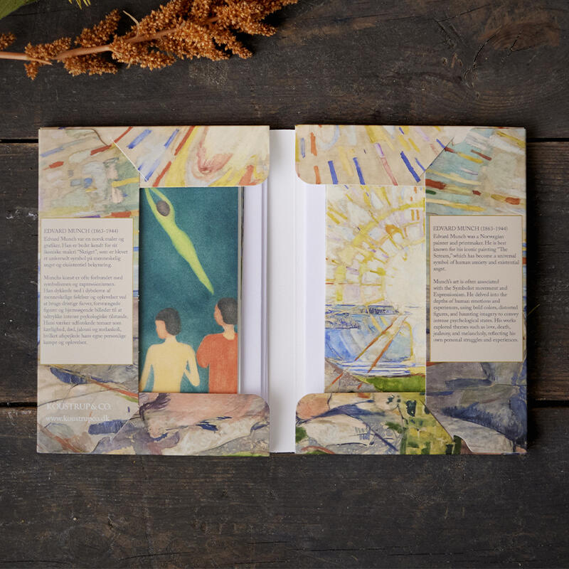 Belles cartes de qualité présentant 8 motifs différents du peintre norvégien Edvard Munch - y compris les œuvres connues "Skriget" et "Solen".