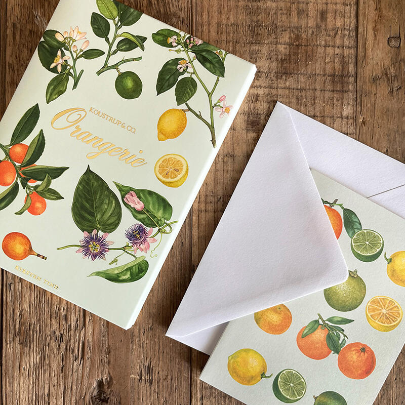 Kirsten Tind, avec sa précision et son trait net, a dessiné une multitude de magnifiques fleurs et plantes, et pour cette pochette de cartes elle a créé huit beaux fruits qui conviennent tous parfaitement à une orangerie.