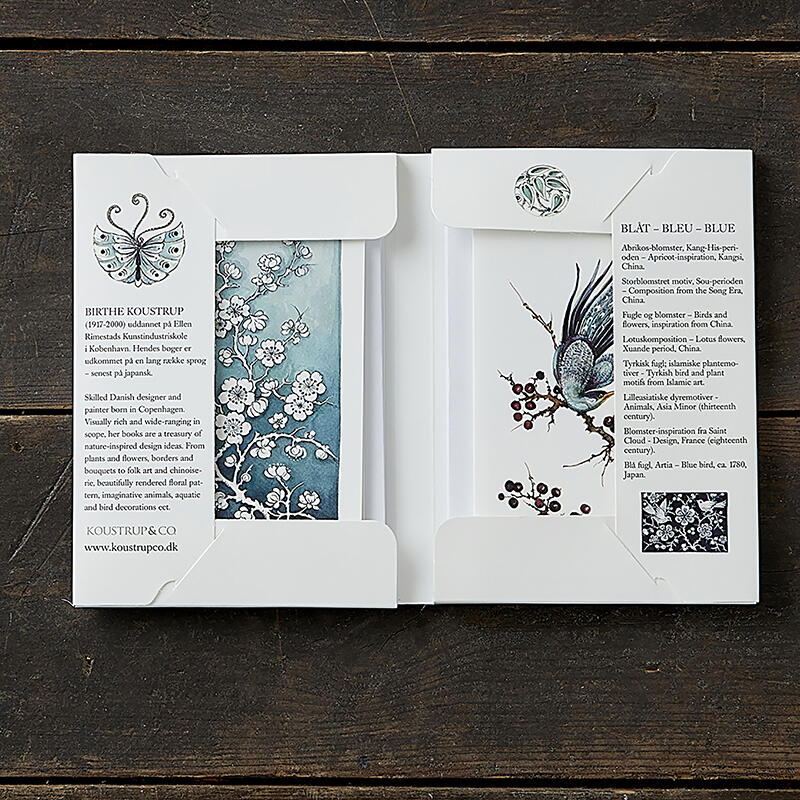 Cartoline di qualità con motivi blu illustrate da Birthe Koustrup.