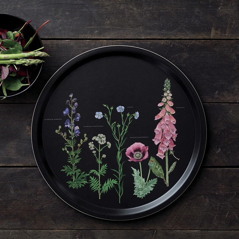 Denne elegante bakke med motiver af blomster dyrket i de gamle klosterhaver, smukt illustreret af Kirsten Tind.