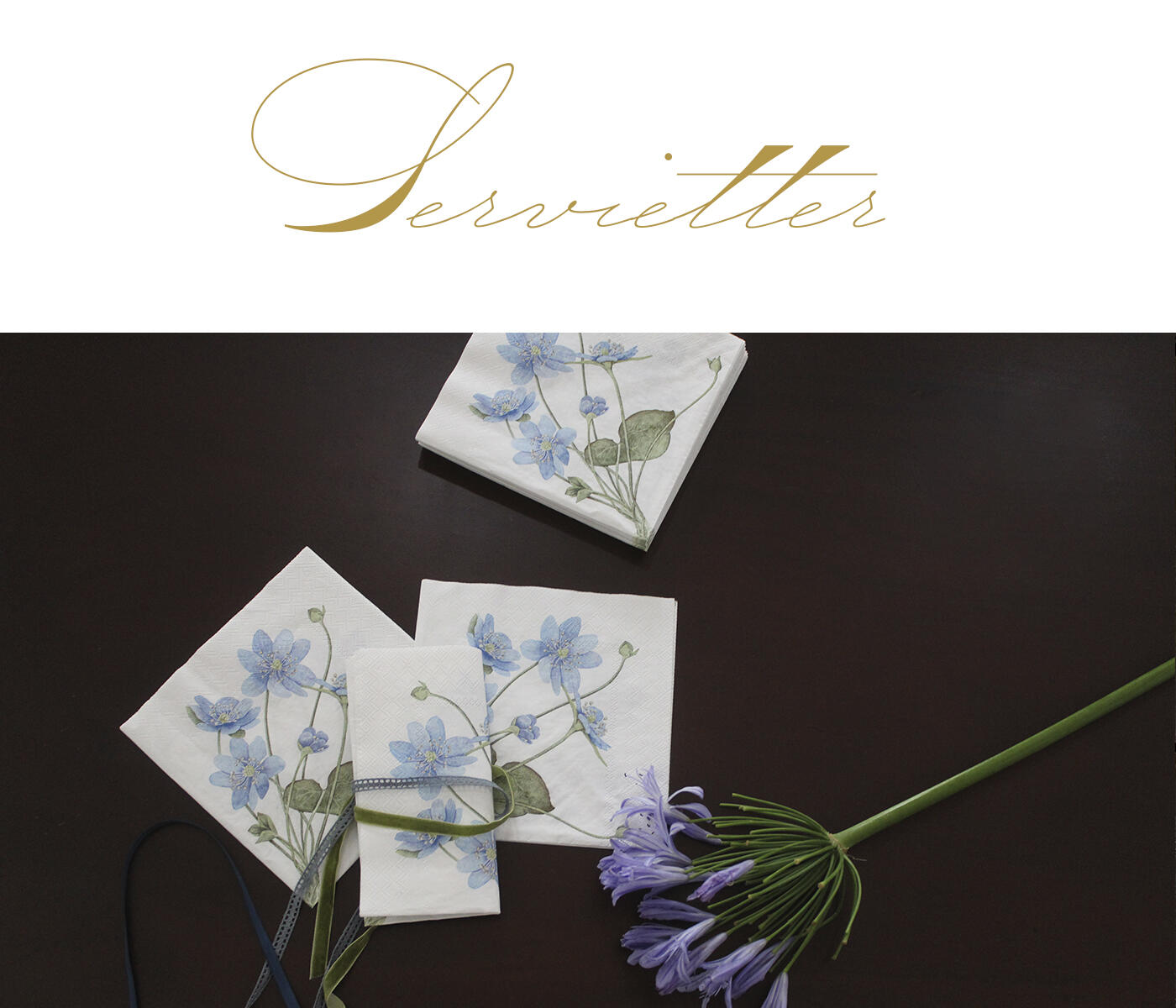 Se vores udvalg af servietter her. Pakkerne indeholder 20 stk. 3-lags servietter med motiv af enten blå anemone, broget fluesnapper eller blomster fra grøftekanten. Servietterne måler 16,5 x 16,5 cm og er produceret i Europa af miljøvenligt genbrugs FSC papir.