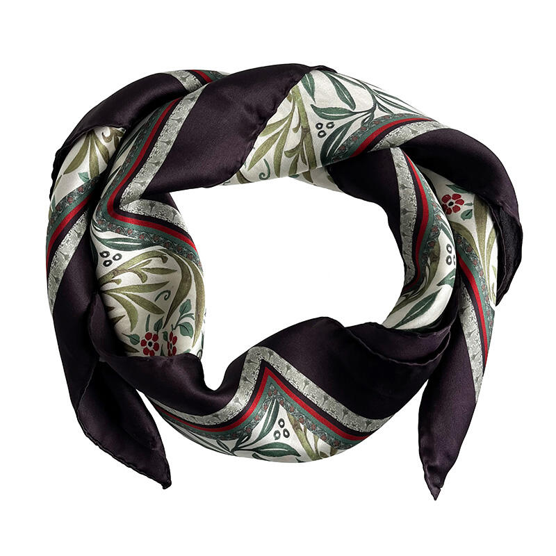 Lyft din stil med en exklusiv sidenhalsduk i William Morris klassiska Oxford Red-motiv. Det detaljerade, botaniskt inspirerade mönstret kombinerar vackra gröna och röda nyanser med eleganta bladrankor, vilket skapar ett varmt och sofistikerat uttryck.